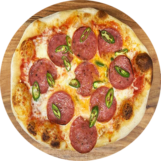DOP San Marzano Tomato Sauce + Mozzarella + Parmesan + Salami + Fresh Serrano Pepper + Chili Oil