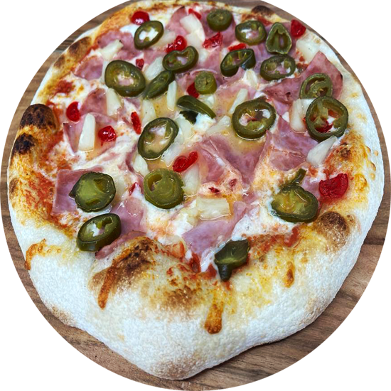 DOP San Marzano Tomato Sauce + Mozzarella + Parmesan + Ham + Pineapple + Cherry + Jalapenos