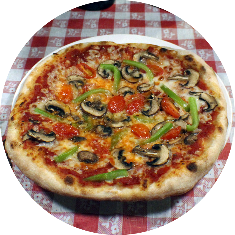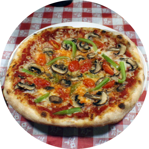 DOP San Marzano Tomato Sauce + Mozzarella + Parmesan + Mushrooms + Bell Pepper + Red Onions + Black Olives