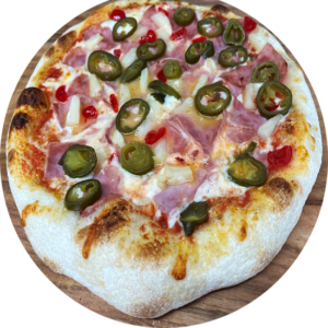 $14.00DOP San Marzano Tomato Sauce + Mozzarella + Parmesan + Ham + Pineapple + Cherry + Jalapenos